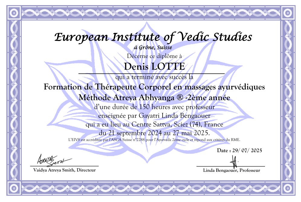 Ayant été très impressionné par l’efficacité des Massages Traditionnels Ayurvédiques, j’ai décidé de privilégier cet aspect dans ma pratique et d’approfondir mes connaissances et compétences : je continue donc à me former à l’institut SATTVA à Sciez avec Linda GAYATRI (https://www.centresattva.com), seul institut habilité à former sur les massages  « Atreya Abhyanga ».